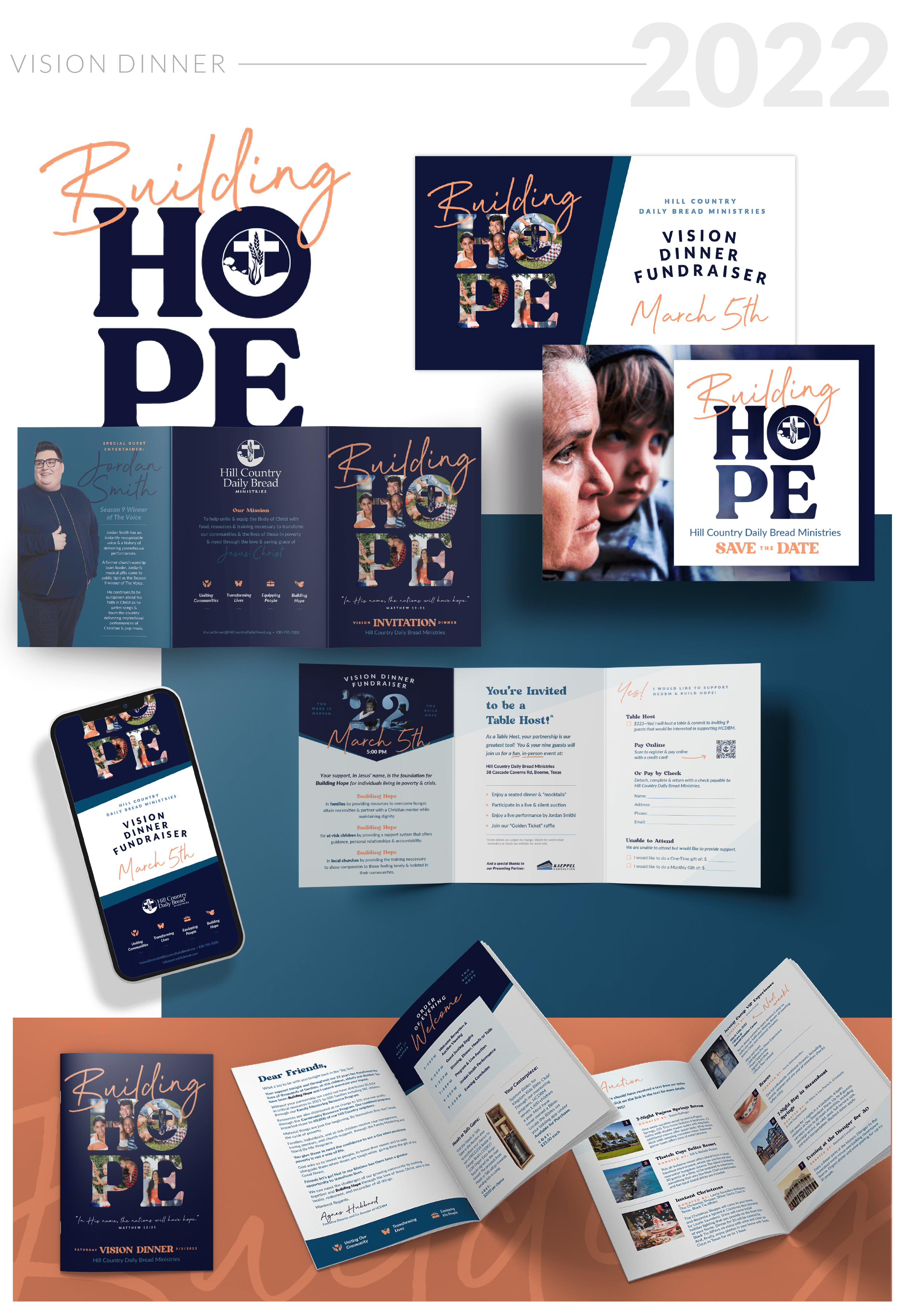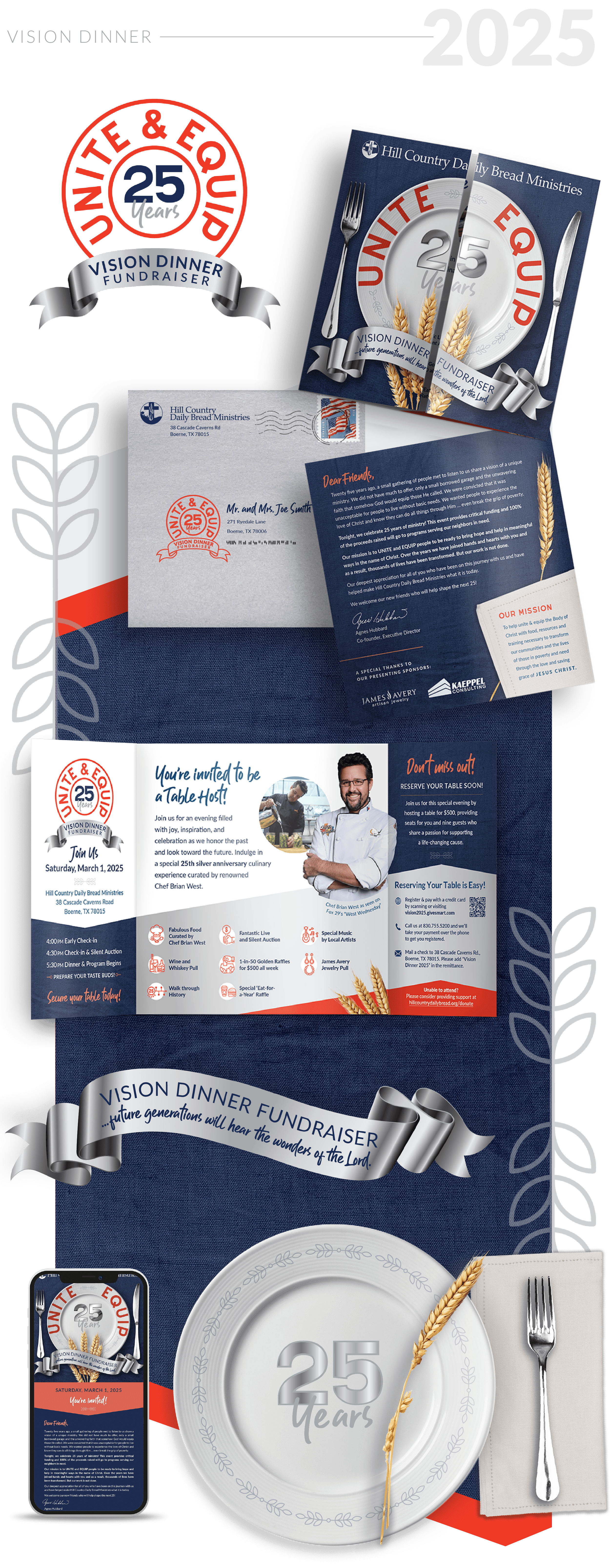 Hill Country Daily Bread is a nonprofit dedicated to transforming lives and communities through faith-based outreach and support. Each year, their Vision Dinner brings together supporters to celebrate their mission and impact. For this annual event, we craft a cohesive visual experience, designing the invitation, developing custom assets that reflect the year’s unique theme, and creating digital materials for web and email to ensure a seamless and engaging presence.