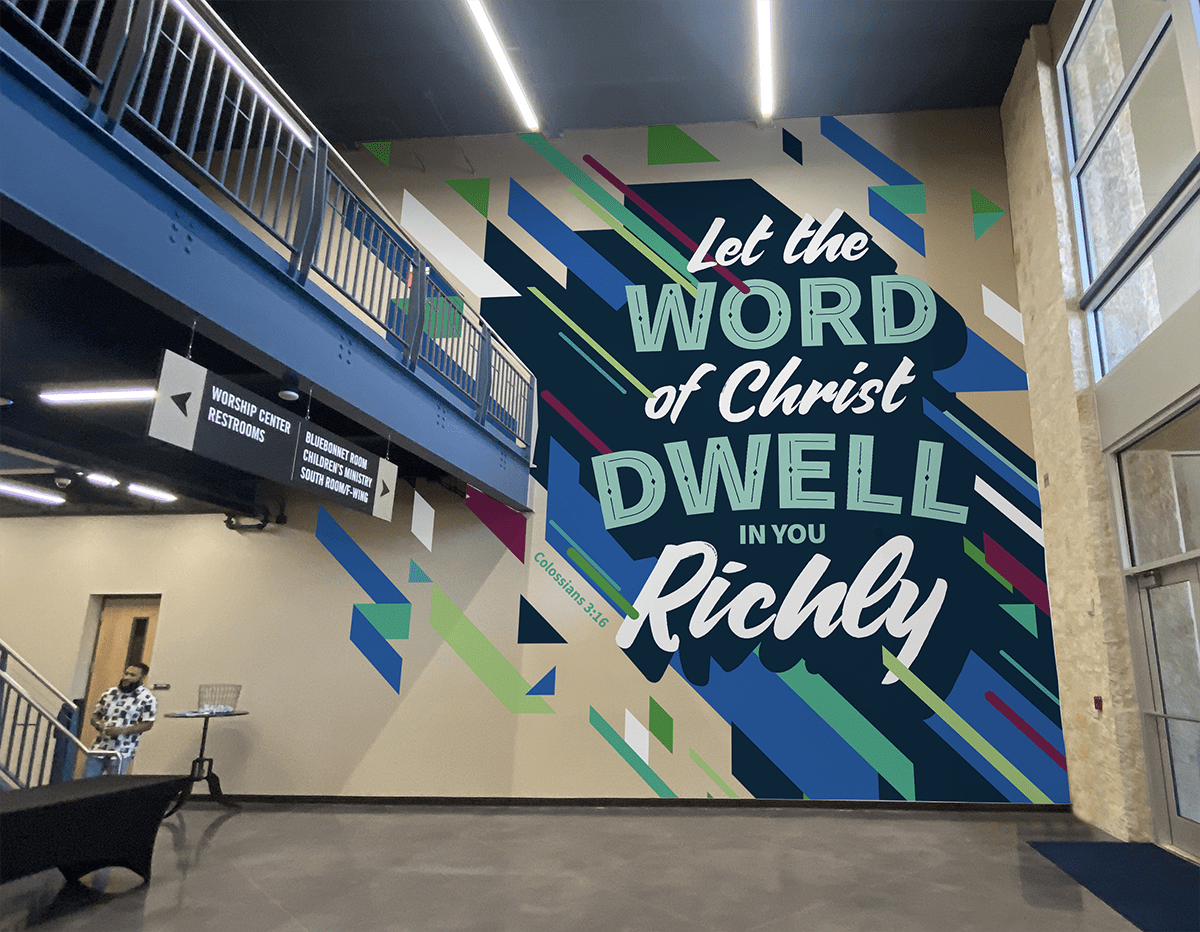 Boasting one of their 4 Discipleship Commitments, this stunning 2-story mural introduced a splash of color to add excitement upon entering and exiting the sanctuary.
