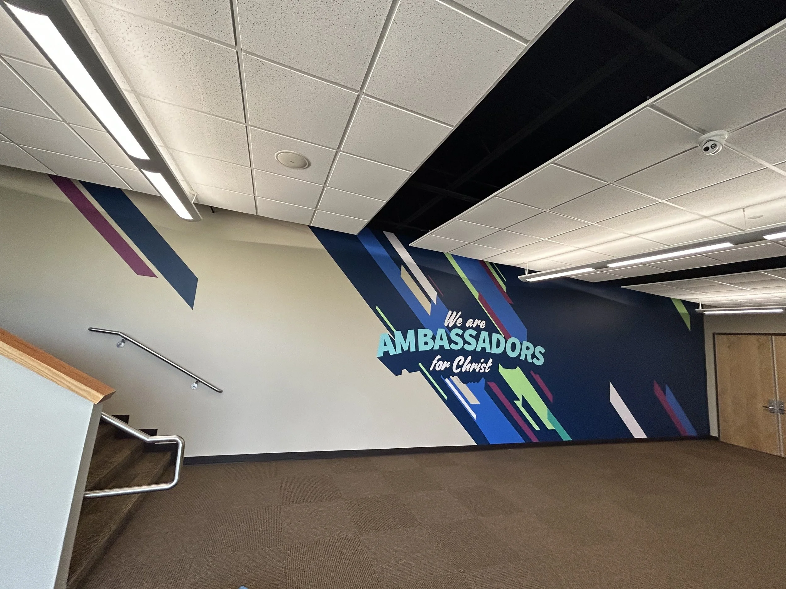 This mural was designed to match the 2-story mural we painted at Oak Hills. This request resulted in mirror-image murals, one on each exit corridor.