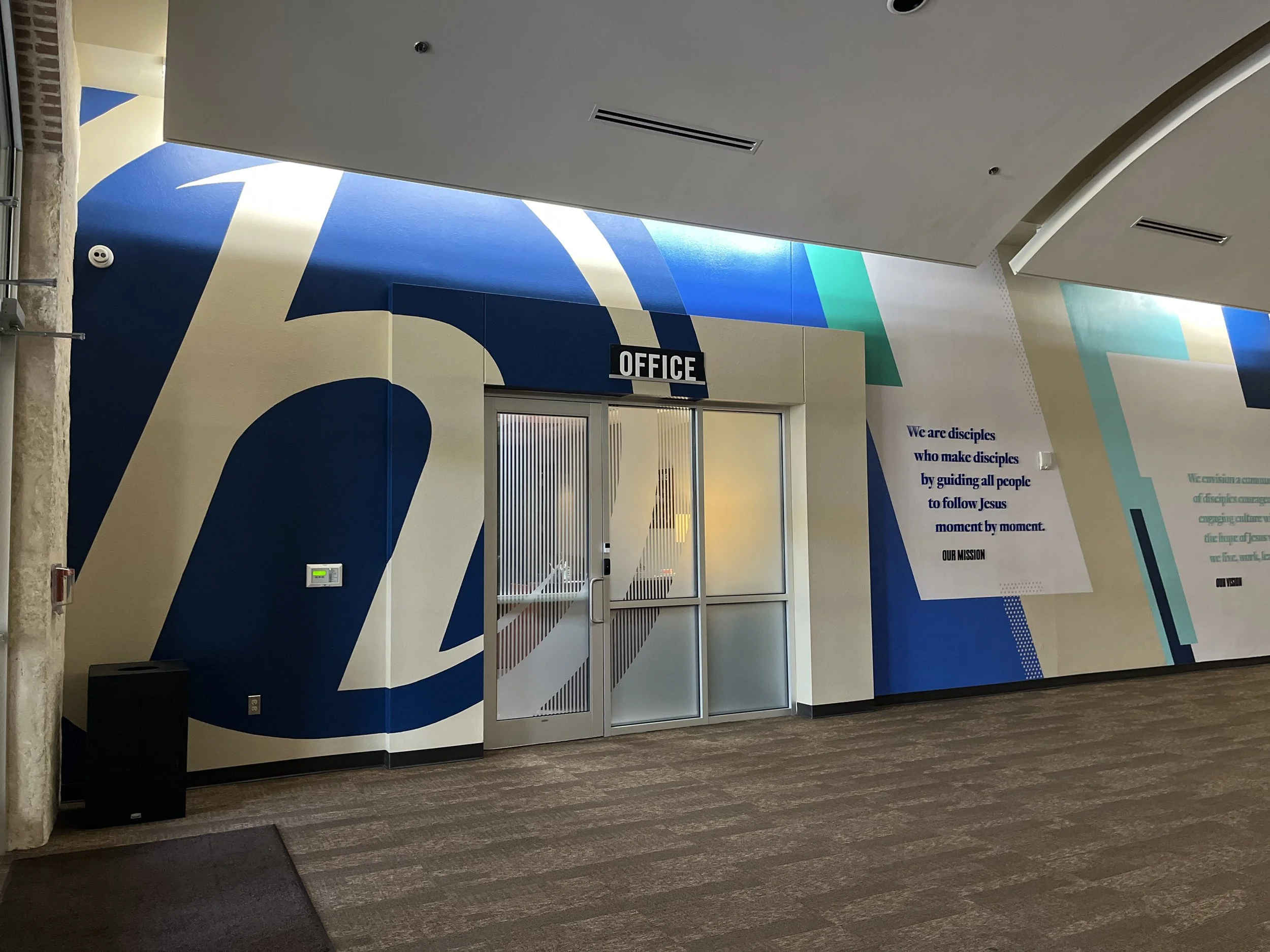 In addition to murals in other portions of the church, we designed and painted a set of murals with 3D elements to the West entrance. Designed to fill a long, empty hallway, these murals share the mission, vision, and values of the church in a way that adds interest and creates an inviting space for lounging.