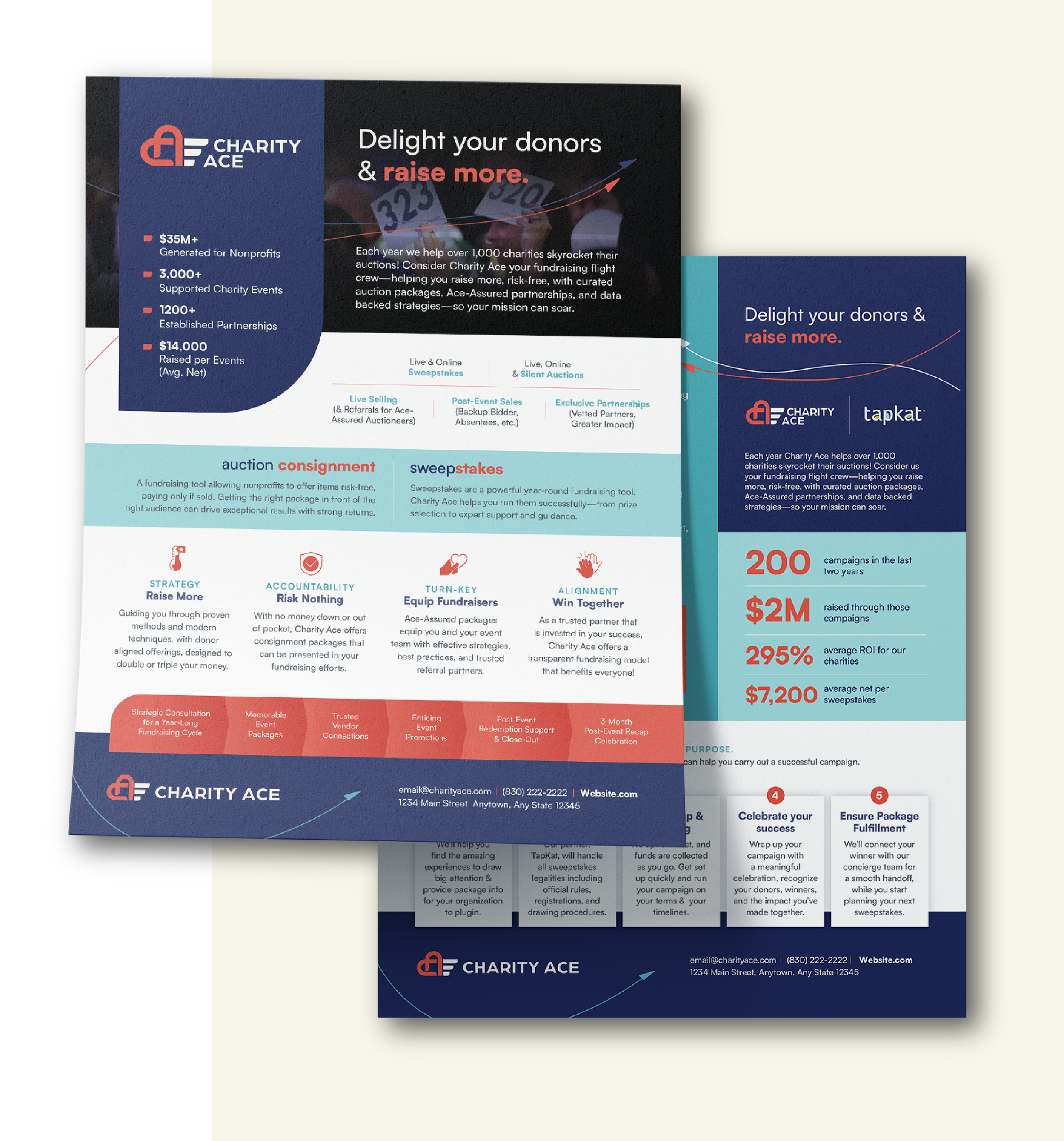 We partnered with CharityAce to develop a cohesive brand system and a full suite of collateral, including a flexible logo system. If you look closely, you’ll see the logomark actually spells out ‘ACE’! Each piece was designed to work together across print and digital, ensuring clarity, consistency, and ease of use.