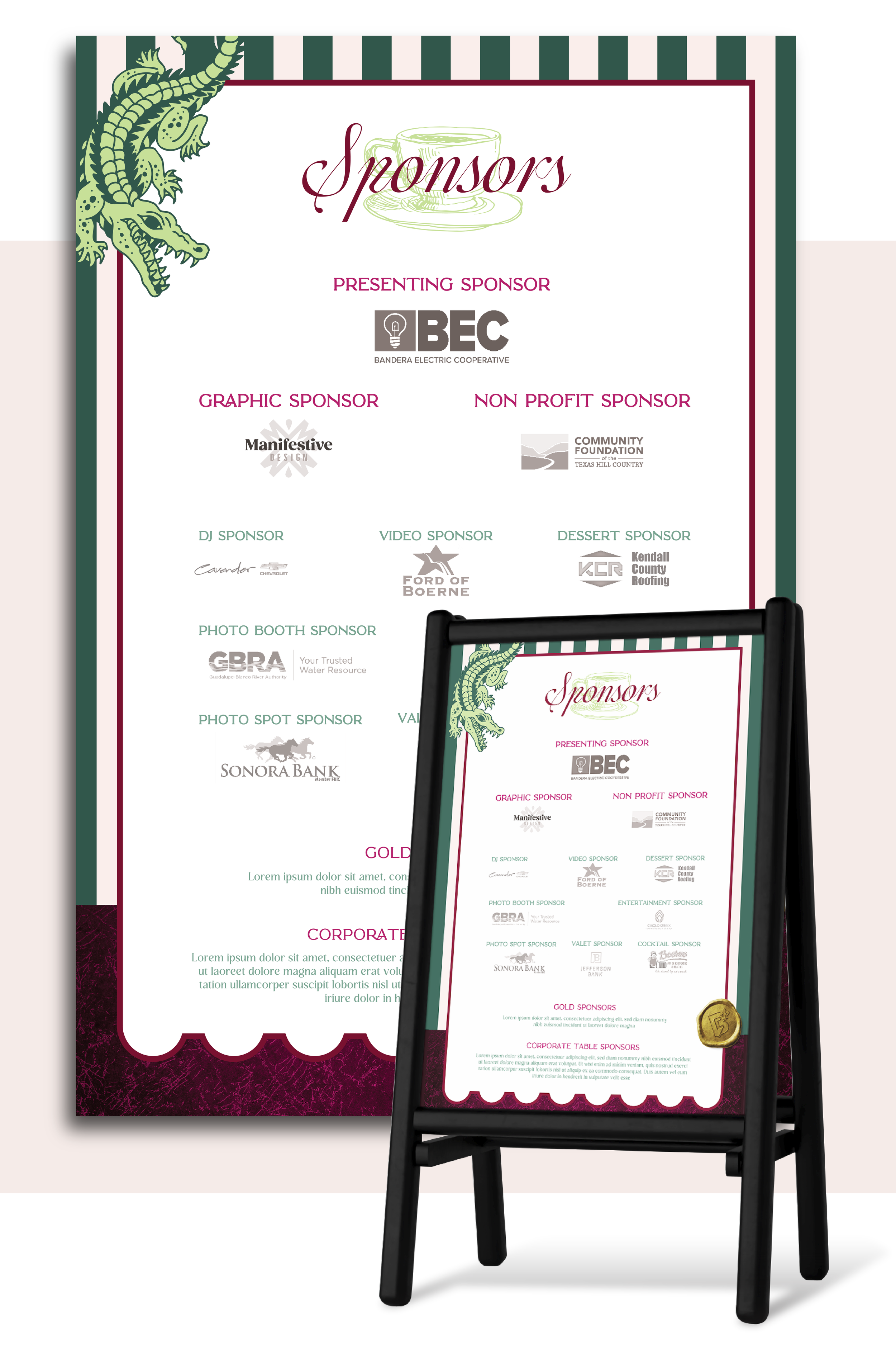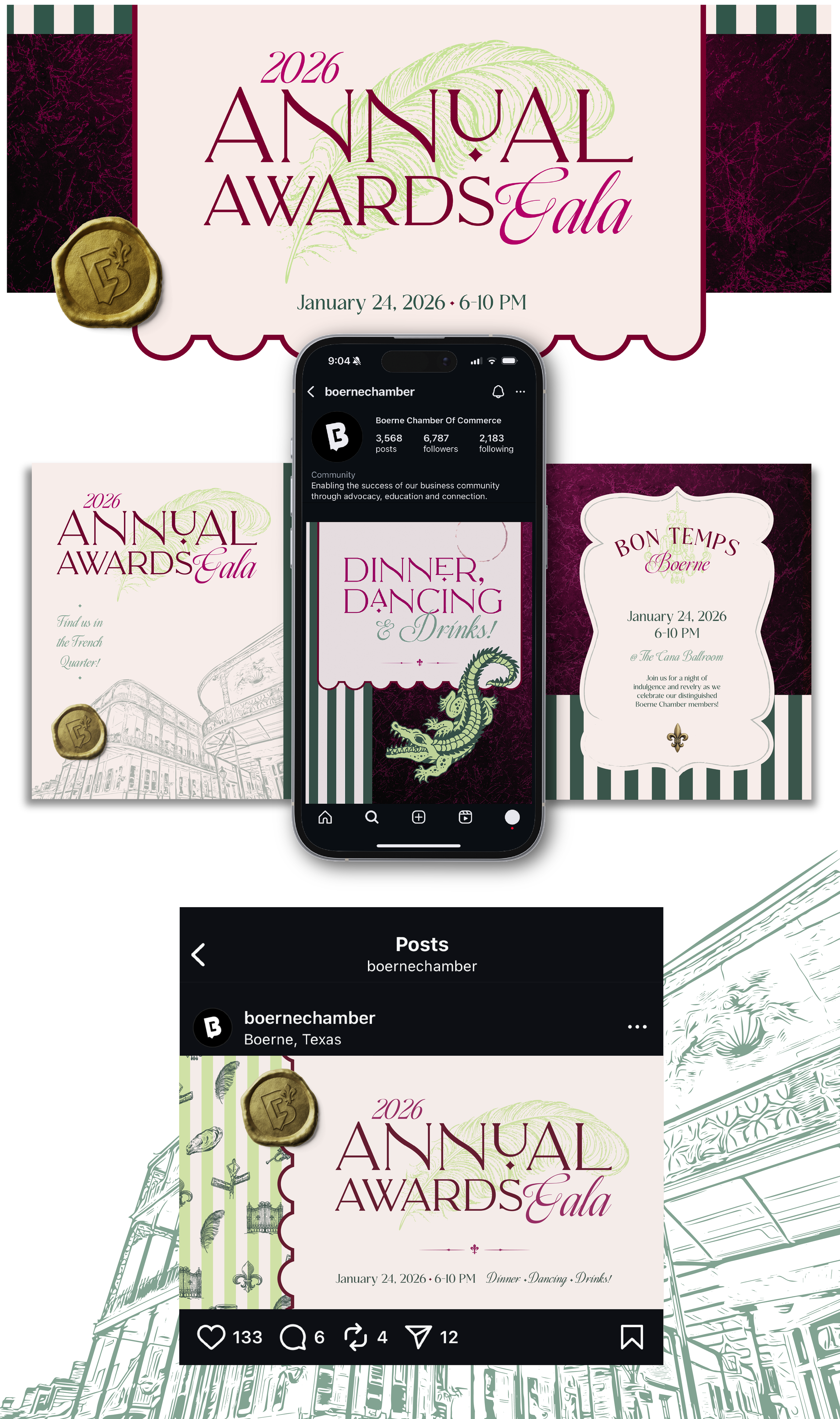 For 2026, we collaborated with their team to develop the theme "Bon Temps, Boerne", inspired by the charm and energy of New Orleans’ French Quarter. We carried this vision through with rich colors, ornate details, and festive design elements that brought the spirit of the Quarter to life.