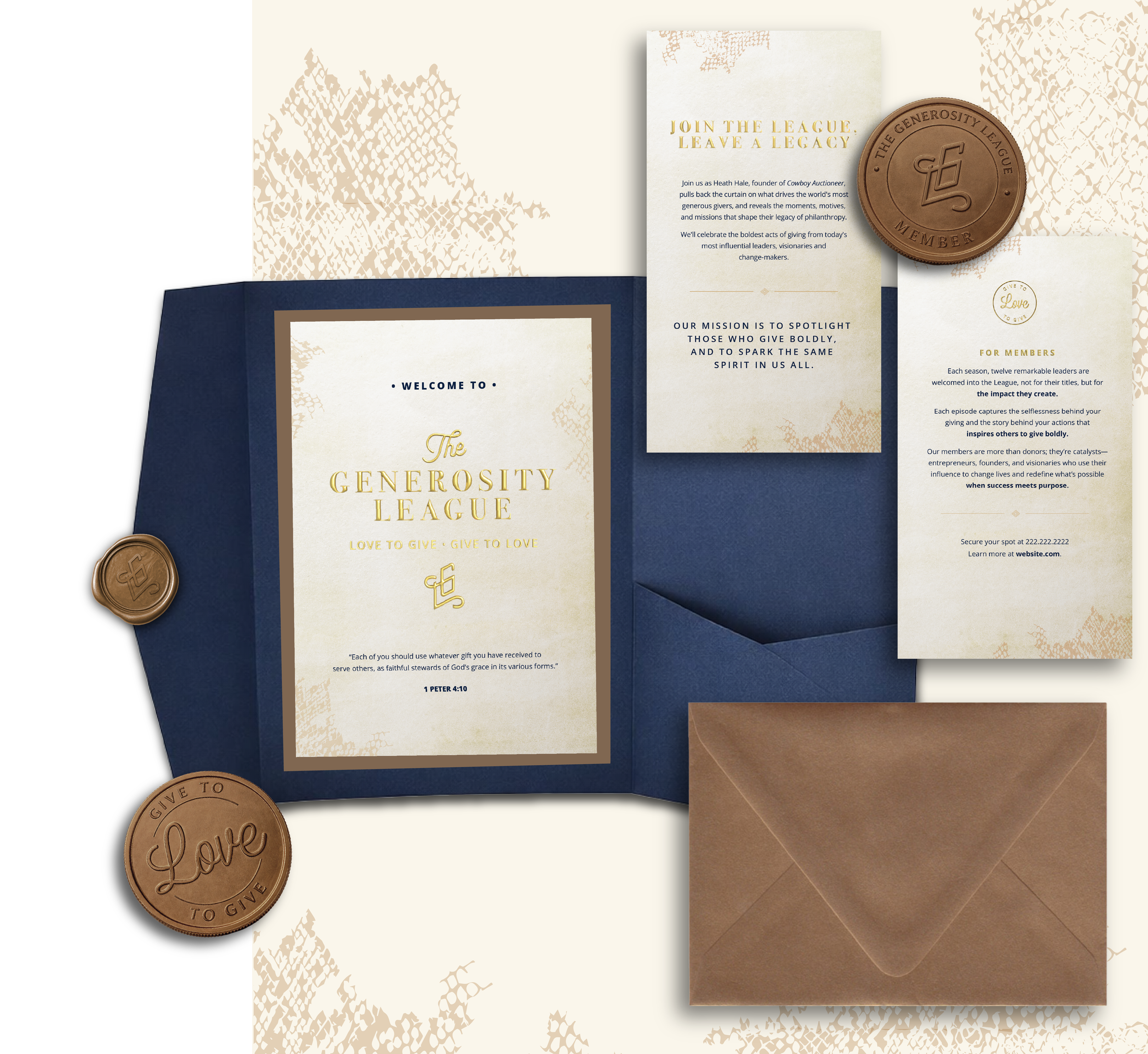 The Generosity League is a podcast dedicated to sharing stories of generosity through conversations with public figures driving meaningful impact through their nonprofit work. We developed the logo and brand identity, designed a welcoming, purpose-driven one-page website, and created a custom invitation suite and membership coin to invite select guests to participate in the show.