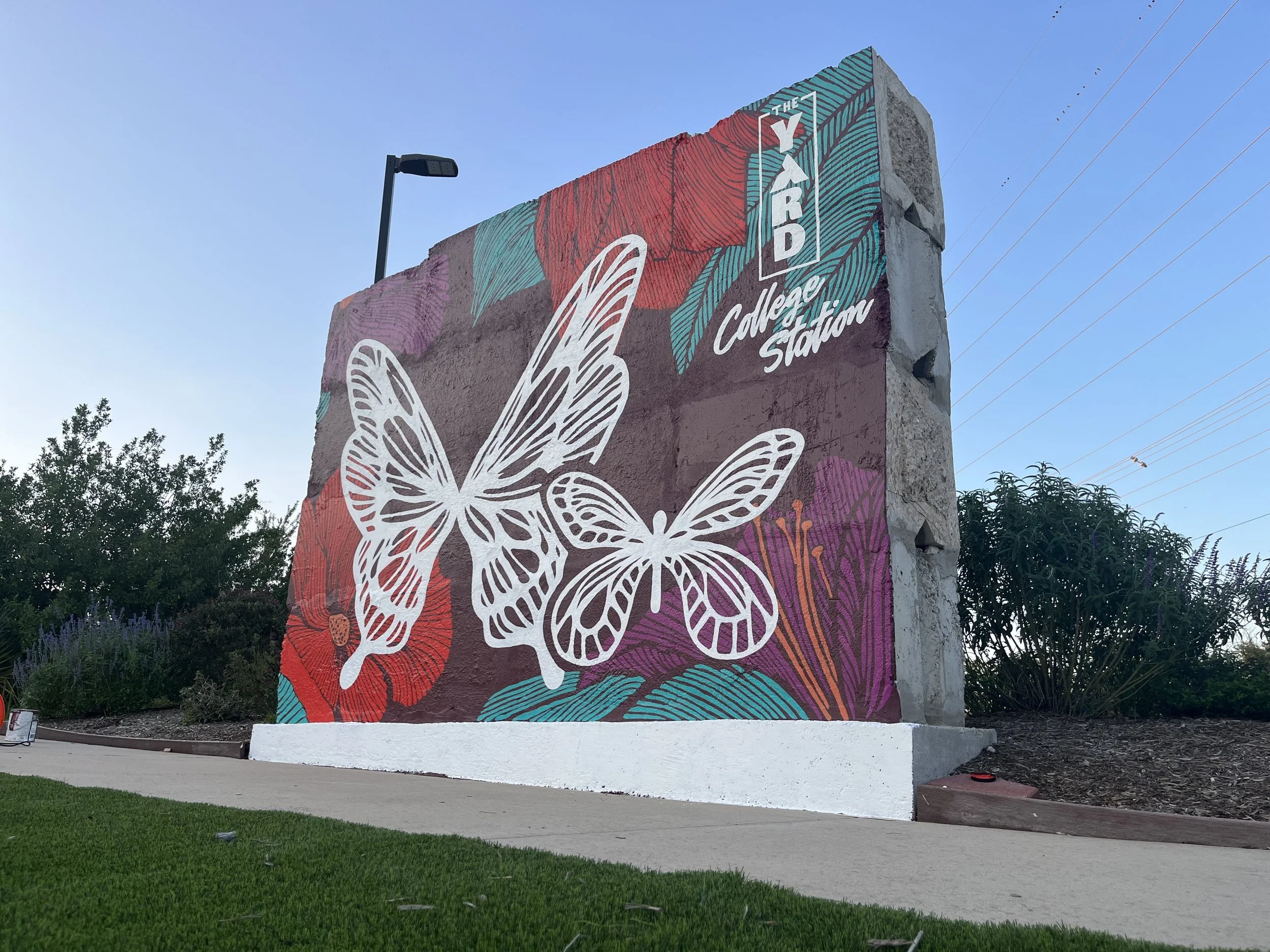 This rock wall in College Station, TX, is located at The Yard, in the middle of a butterfly garden. There is a large turf grass area, surrounded by a co-working space, a wine bar, and other retail spaces. It is the perfect place to gather, eat, and play, and snap a perfect photo!